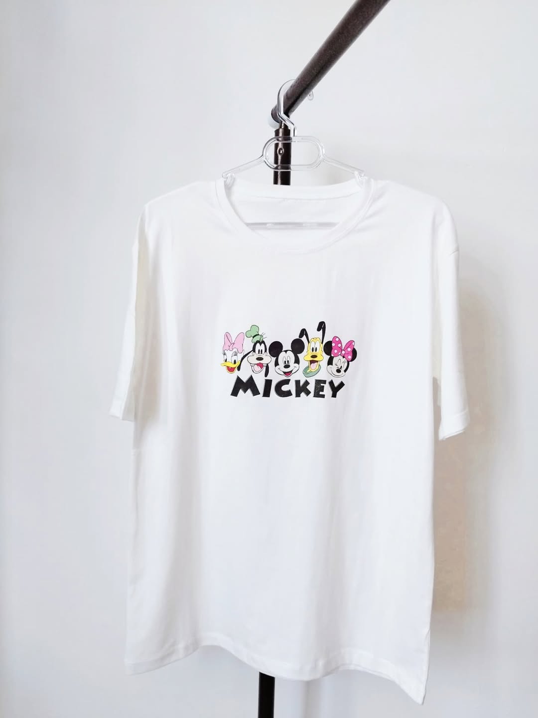 تیشرت زنانه نخ پنبه قواره آزاد آستین کوتاه فری سایز طرح میکی فمیلی