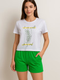 تیشرت طرح برگ با طراحی خاص و جذابش، حس خنکی و سرسبزی رو به استایلت میده، و وقتی با شورتکهای رنگی شاد ست میشه، یه ترکیب دلبرانه و پرانرژی میسازه
