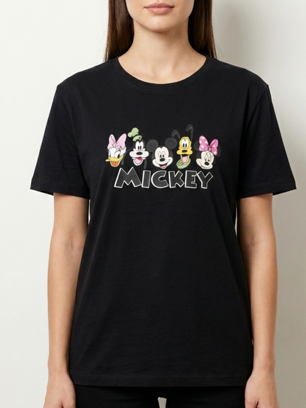 ناموجودتیشرت زنانه نخ پنبه قواره آزاد آستین کوتاه فری سایز طرح میکی فمیلی